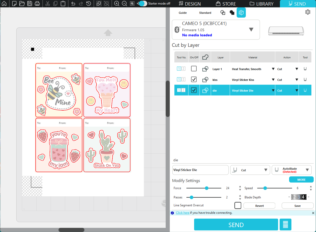 Select the kiss layer and choose your Material. Adjust the settings as needed. I used the following cut settings with my Cameo 5 but remember that these will vary depending on your machine, blade sharpness, and brand of material.